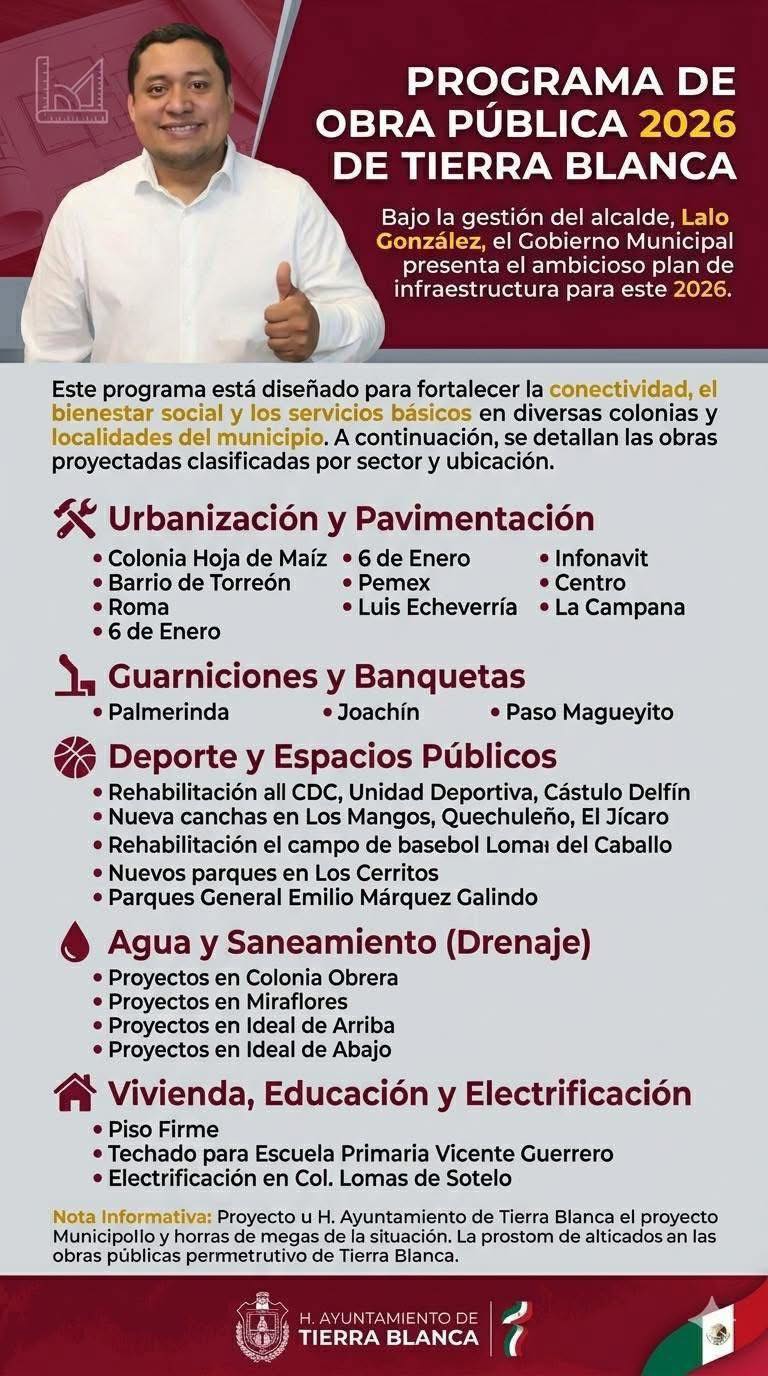 Tierra Blanca acelera obras: Lalo González lanza ambicioso plan 2026