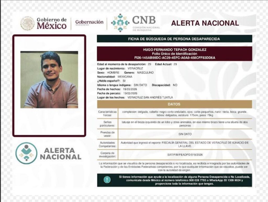 Autoridades activaron una alerta de búsqueda para localizar a Hugo Fernando Tepach González, de 29 años de edad, quien fue reportado como desaparecido desde el pasado 19 de marzo en este municipio de la región de Los Tuxtlas.