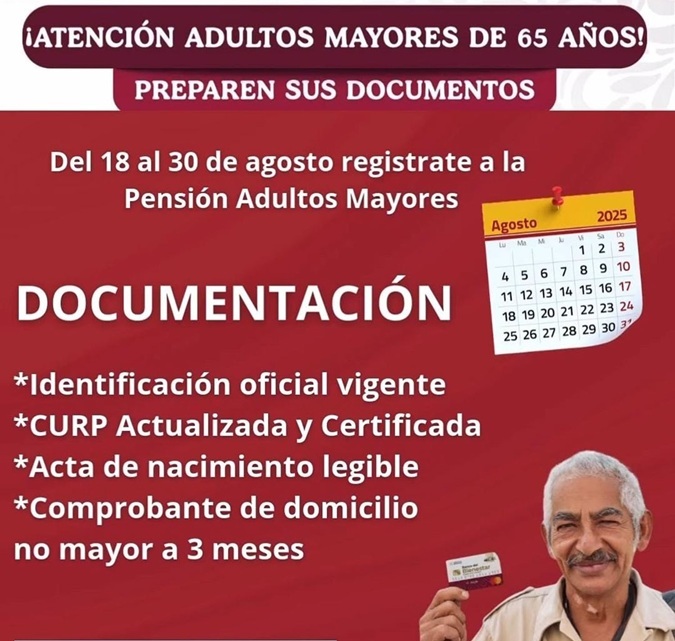 Entre los requisitos los adultos mayores deberán presentar identificación oficial vigente, CURP actualizada y certificada, acta de nacimiento legible, comprobante de domicilio no mayor a tres meses.