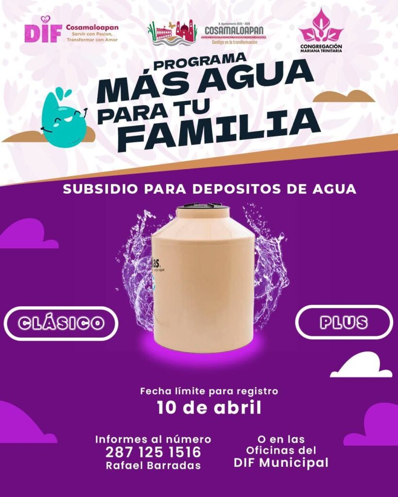 Con el objetivo de mejorar el acceso al agua en los hogares y fortalecer la economía familiar, el DIF Municipal de Cosamaloapan, en coordinación con el Ayuntamiento y la Congregación Mariana Trinitaria, puso en marcha el programa “Más agua para tu familia”.