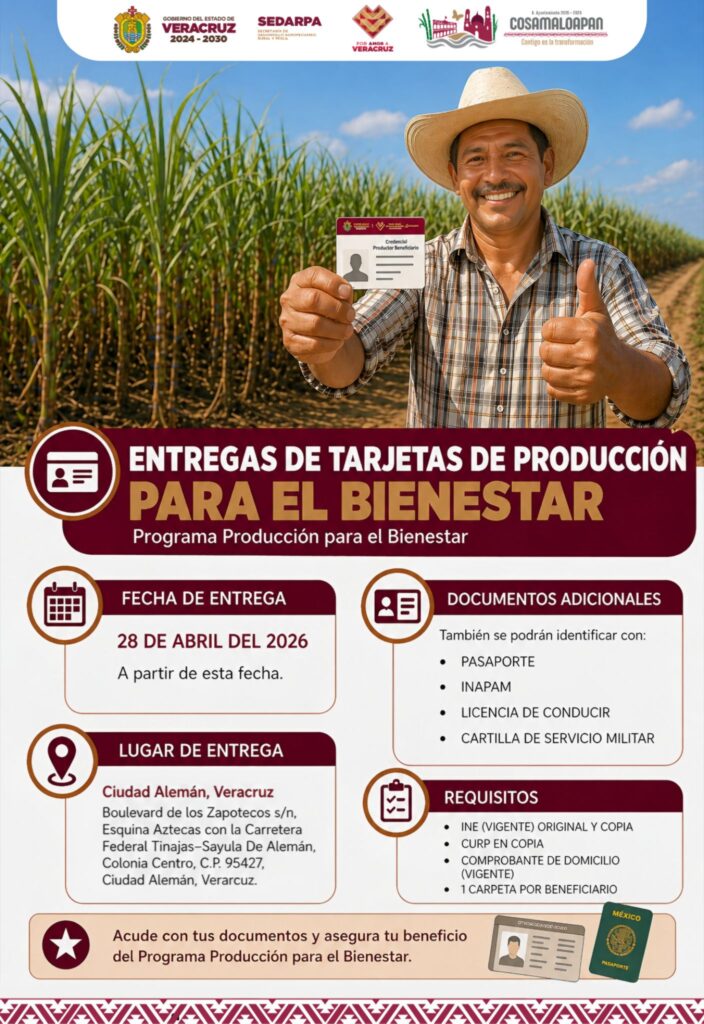 A partir del próximo 28 de abril de 2026 dará inicio la entrega de tarjetas del programa federal Producción para el Bienestar, una estrategia clave para fortalecer al sector agrícola en la región.
