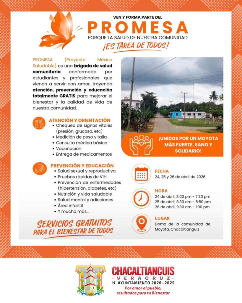 Con el objetivo de acercar servicios médicos y promover el bienestar comunitario, la brigada PROMESA (Proyecto México Saludable) realizará una jornada integral de salud en la comunidad de Moyota, en el municipio de Chacaltianguis.