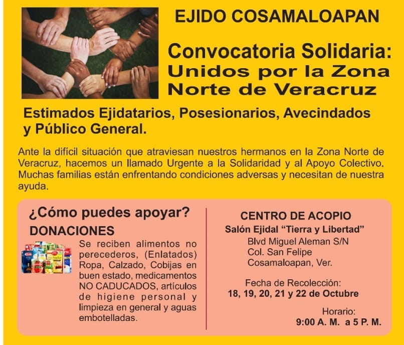 Centro de acopio acaba de instalar la presidenta del comisariado del ejido “Cosamaloapan”, Marvella Prieto Cervantes, en el salón “Tierra y Libertad”, convocando a ejidatarios, posesionarios, avecindados, y a la población en general, a aportar, para ayudar a los damnificados del norte del estado.