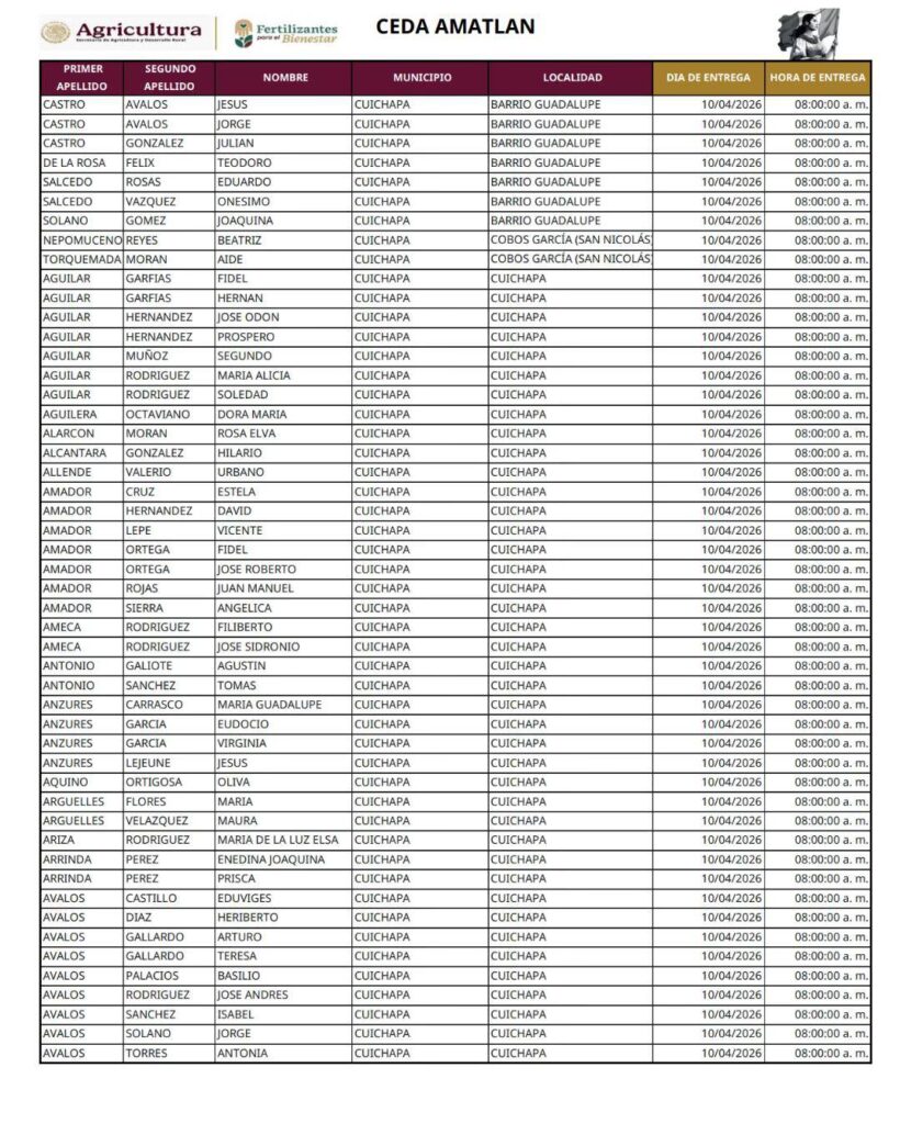 De acuerdo con el aviso oficial, la entrega del insumo se realizará del 10 al 14 de abril en la CEDA de Amatlán de los Reyes, ubicada en avenida Guerrero número 16, en la zona conocida como Puente de los Aguacates.