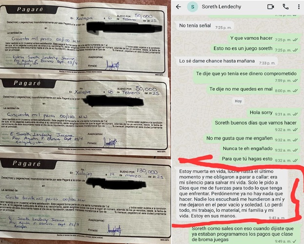 De acuerdo con la información en poder del reportero, las víctimas han aportado evidencias que incluyen transferencias bancarias, pagarés y mensajes de texto; estimándose que ya suman aproximadamente 75 las personas defraudadas en municipios como Xalapa, Veracruz, Las Vigas, Cempoala y Cardel.