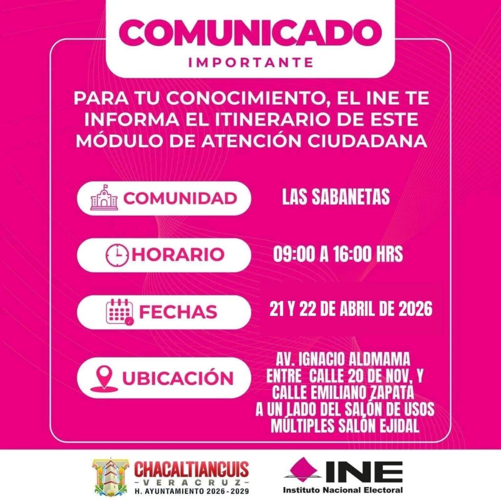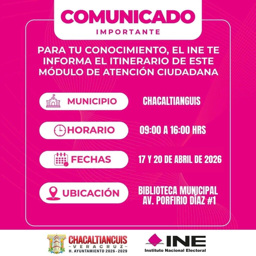 El Instituto Nacional Electoral (INE) informó sobre la instalación de un módulo de atención ciudadana itinerante en el municipio de Chacaltianguis, con el objetivo de acercar sus servicios a la población.