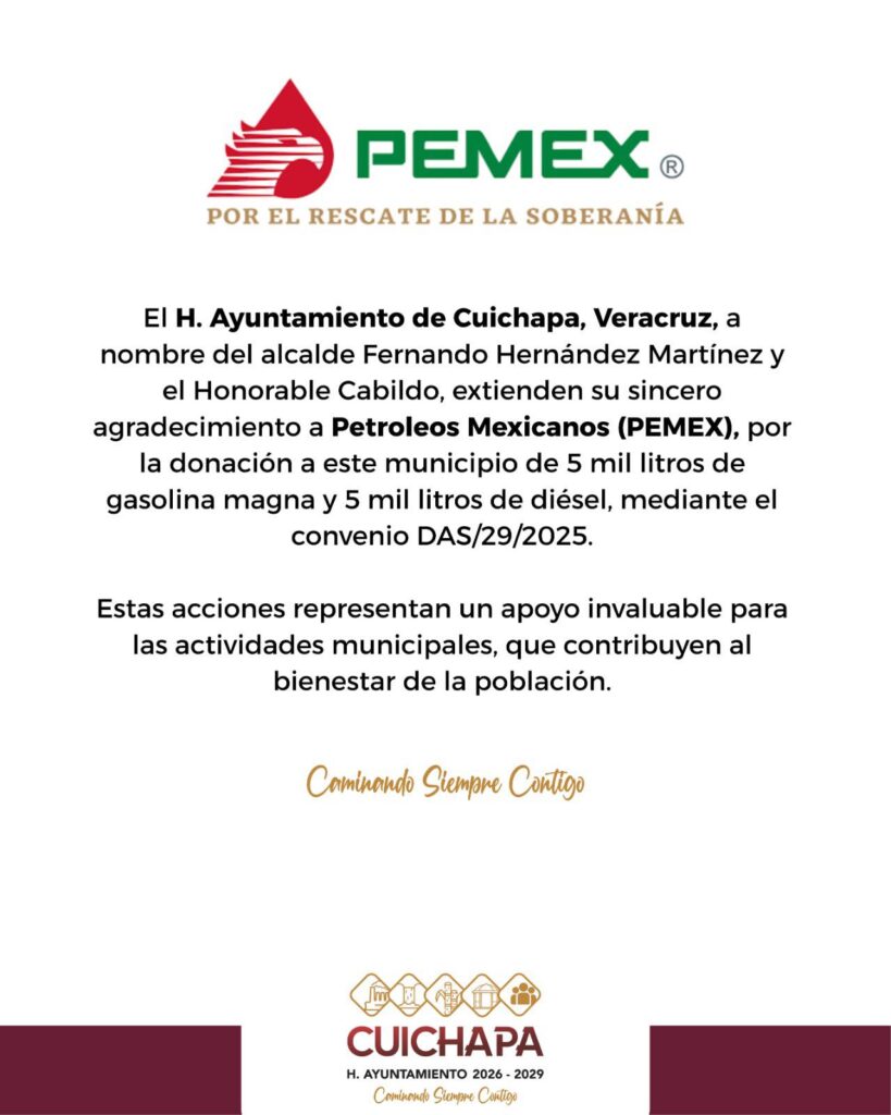 En un hecho que refuerza la operatividad del gobierno municipal, Petróleos Mexicanos (PEMEX) realizó la donación de 10 mil litros de combustible al Ayuntamiento de Cuichapa, como parte de un convenio institucional.