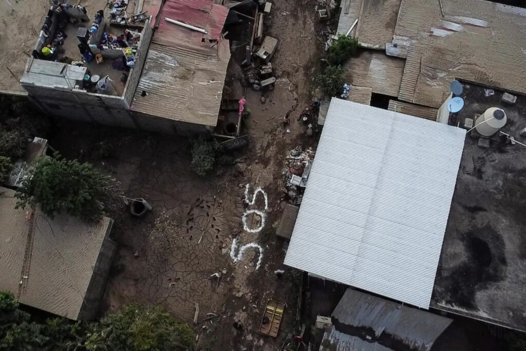 Una imagen aérea revela la desesperación: habitantes de Poza Rica caminan entre lodo y devastación, junto a un enorme letrero de “SOS” trazado en cal.