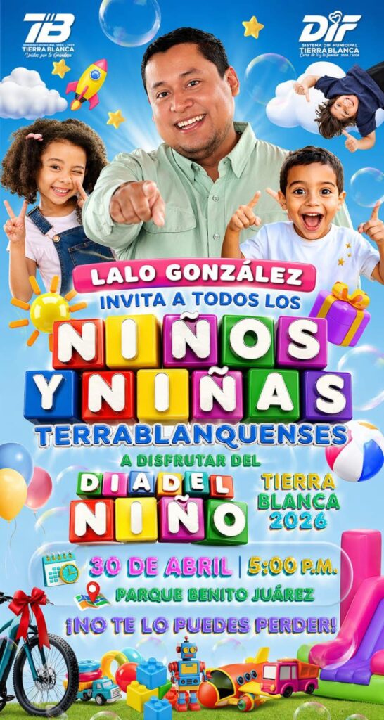 Con el objetivo de fomentar la convivencia familiar y regalar momentos de alegría a la niñez, el Gobierno Municipal de Tierra Blanca, en coordinación con el DIF Municipal, anunció una gran celebración por el Día del Niño 2026, que se llevará a cabo este 30 de abril a partir de las 5:00 de la tarde en el Parque Benito Juárez.