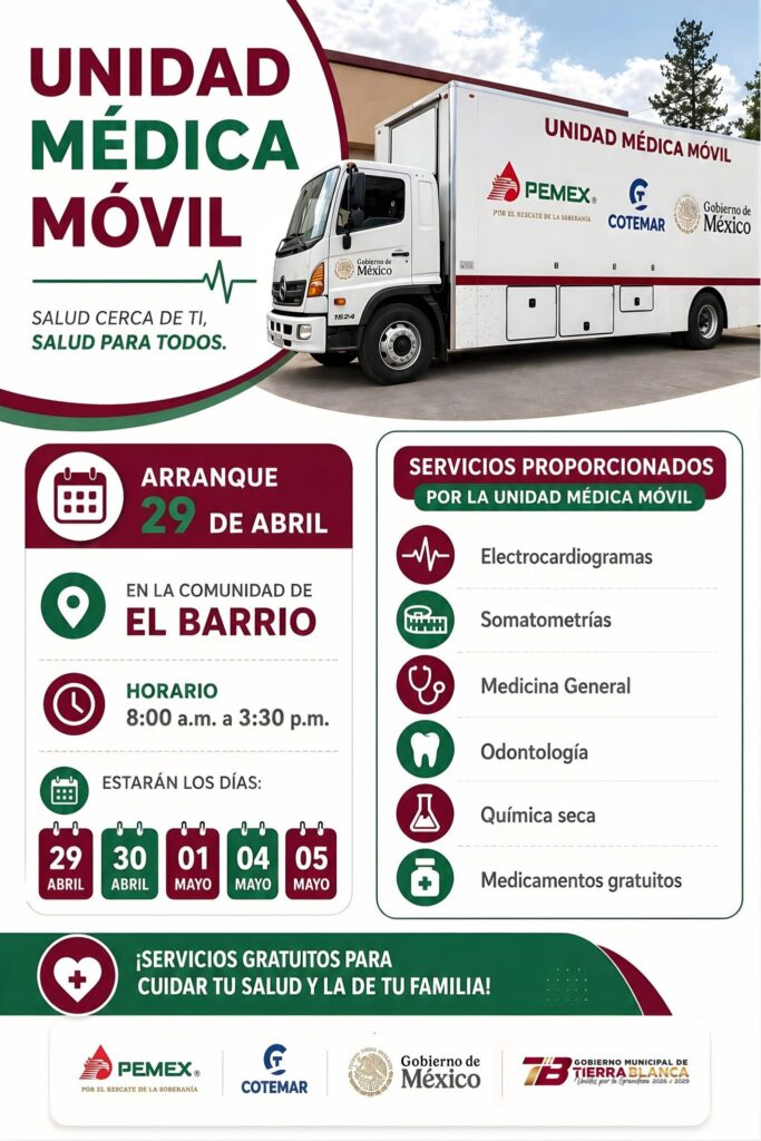 Con el objetivo de acercar servicios de salud a la población, fue puesta en marcha una Unidad Médica Móvil que ofrecerá atención gratuita en la comunidad de El Barrio, en el municipio de Tierra Blanca.