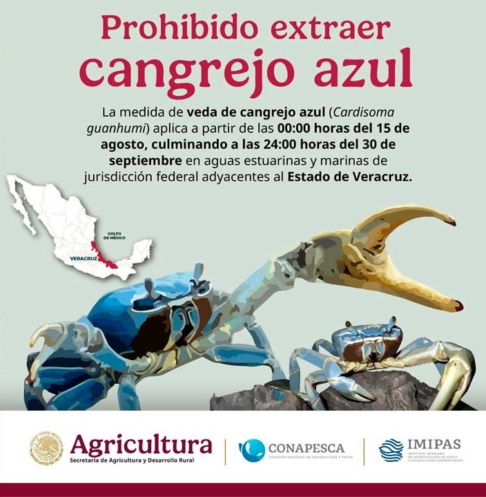 A partir de hoy y hasta el 30 de septiembre, entra en vigor la veda temporal para la pesca comercial del cangrejo azul o de tierra (Cardisoma guanhumi) en aguas estuarinas y marinas de jurisdicción federal adyacentes al estado de Veracruz, informó la Comisión Nacional de Acuacultura y Pesca.