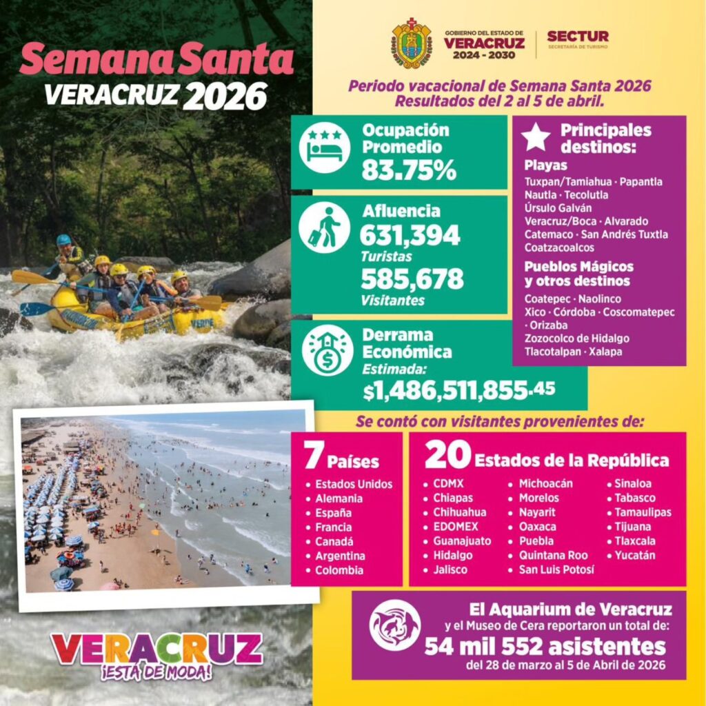 El estado de Veracruz vivió una de sus mejores temporadas turísticas durante la Semana Santa 2026, al registrar una afluencia de más de 631 mil turistas y una derrama económica superior a los 1,486 millones de pesos, de acuerdo con datos oficiales de la Secretaría de Turismo (SECTUR).
